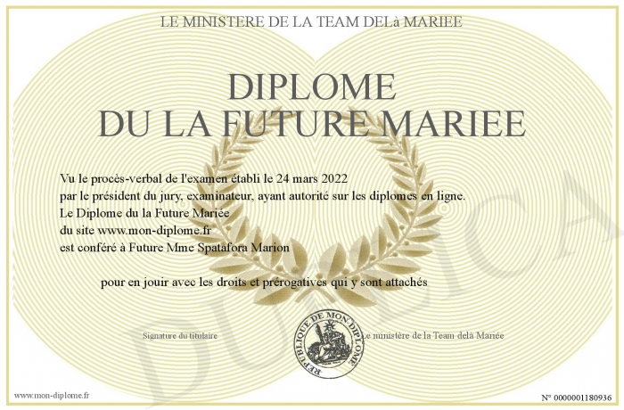 Envoyez par email votre Diplôme du la Future Mariée personalisé