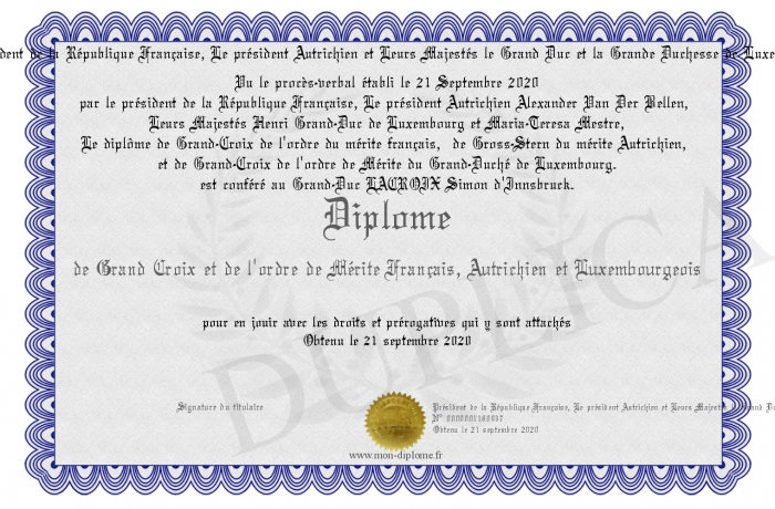 Envoyez par email votre Diplôme de Grand Croix et de l'ordre de Mérite Français, Autrichien et Luxembourgeois personalisé