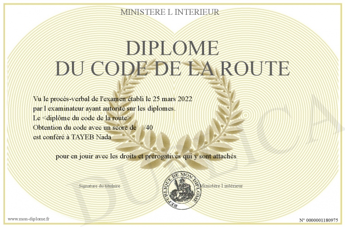 Envoyez par email votre Diplôme du code de la route personalisé