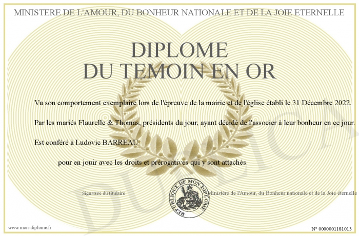 Envoyez par email votre Diplôme du Témoin en OR personalisé