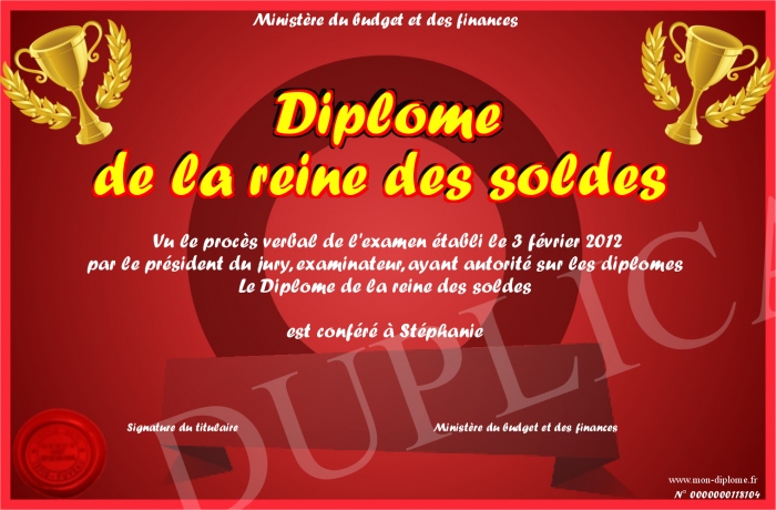 Envoyez par email votre Diplôme de la reine des soldes personalisé