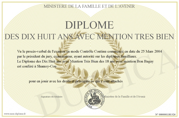 Envoyez par email votre Diplôme des Dix Huit ans avec Mention Très Bien personalisé