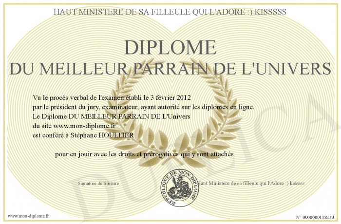 Envoyez par email votre Diplôme DU MEILLEUR PARRAIN DE L'Univers personalisé