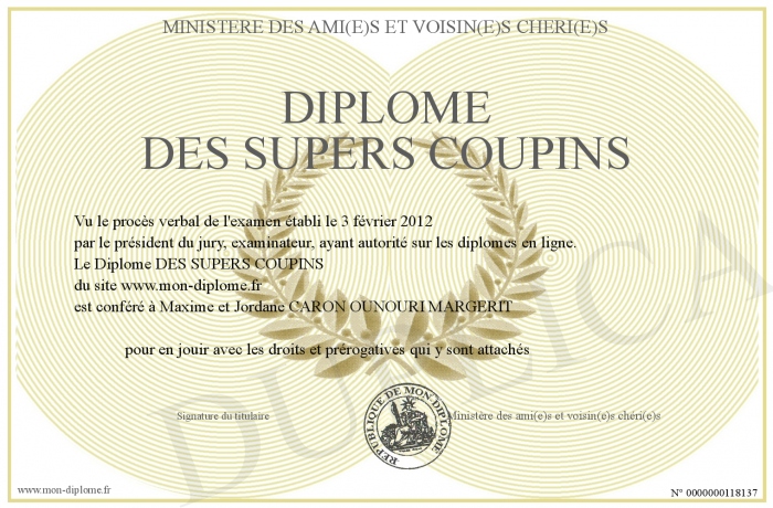Envoyez par email votre Diplôme DES SUPERS COUPINS personalisé