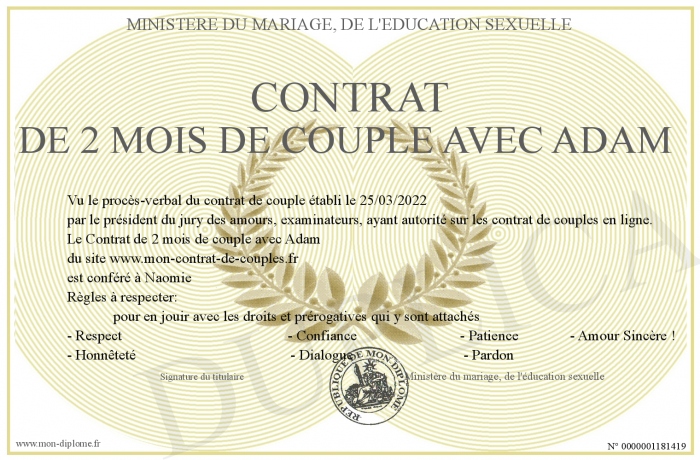 Envoyez par email votre Contrat de 2 mois de couple avec Adam personalisé