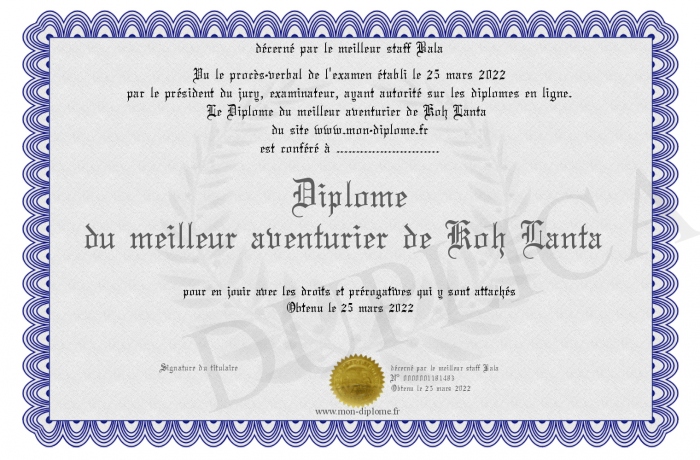Envoyez par email votre Diplôme du meilleur aventurier de Koh Lanta personalisé