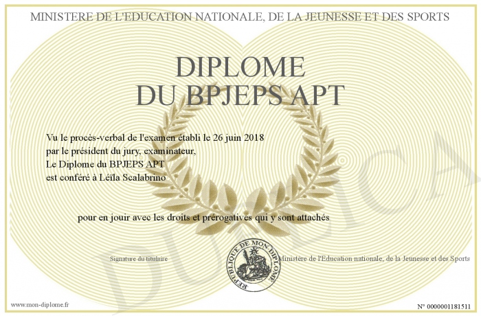 Envoyez par email votre Diplôme du BPJEPS APT personalisé