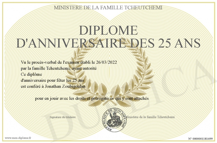 Envoyez par email votre Diplôme d'Anniversaire des 25 ans personalisé
