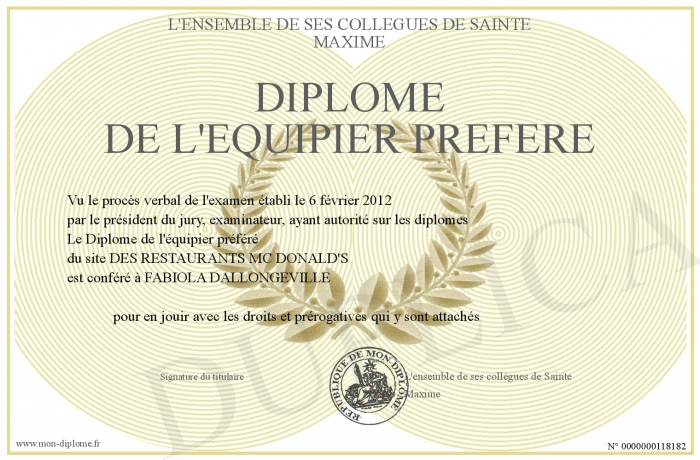 Envoyez par email votre Diplôme de l'équipier préféré personalisé