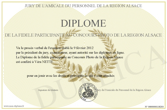 Envoyez par email votre Diplôme de la fidèle participante au Concours Photo de la Région Alsace personalisé