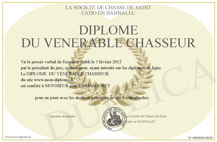 Envoyez par email votre DIPLOME DU VENERABLE CHASSEUR personalisé