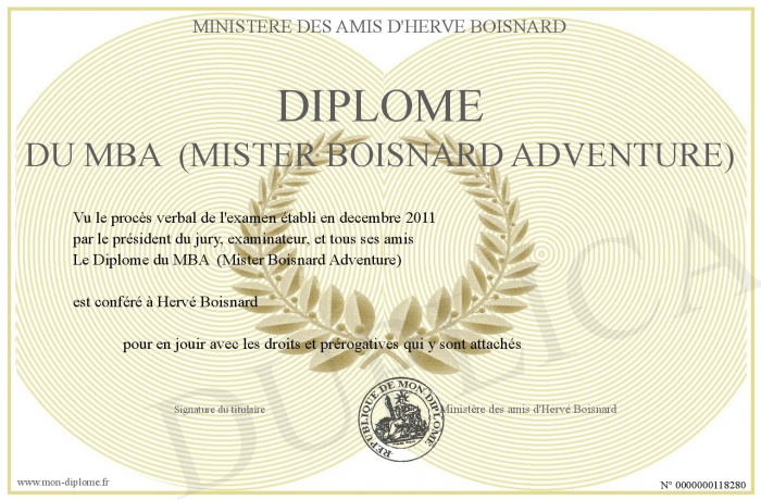 Envoyez par email votre Diplôme du MBA (Mister Boisnard Adventure) personalisé