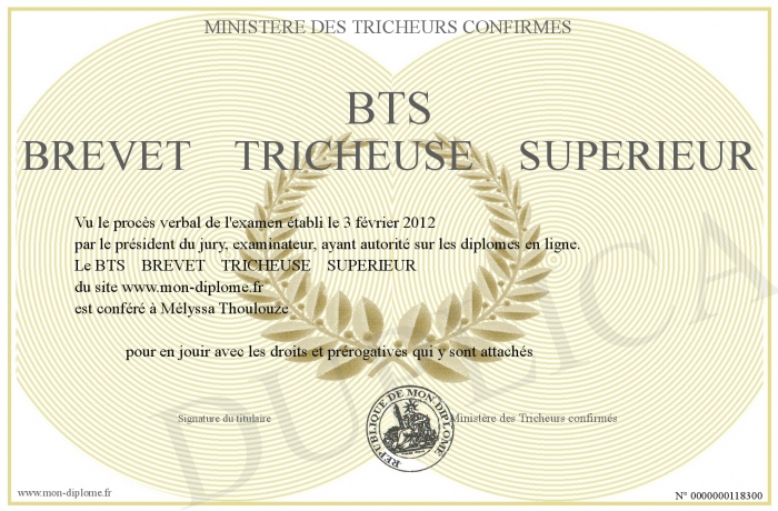 Envoyez par email votre BTS BREVET TRICHEUSE SUPERIEUR personalisé