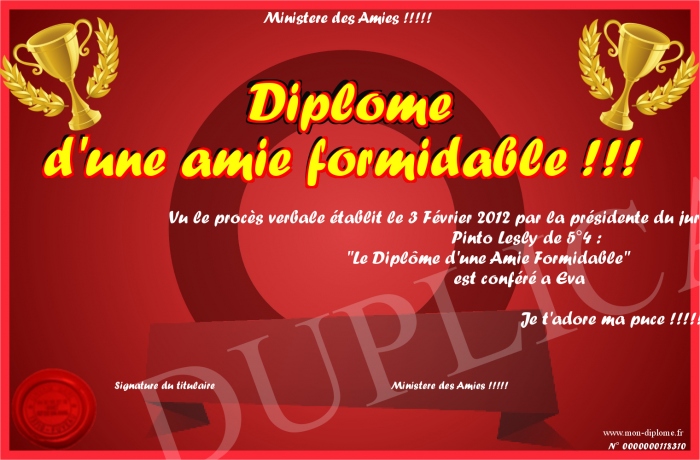 Envoyez par email votre Diplome d'une amie formidable !!! personalisé