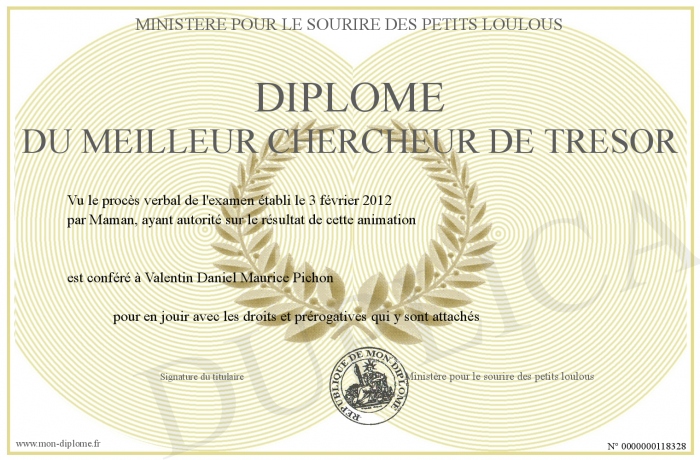 Envoyez par email votre Diplôme du meilleur chercheur de trésor personalisé