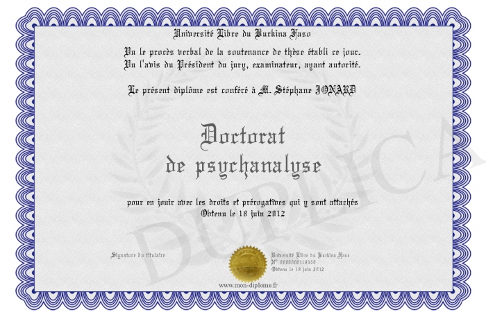 Envoyez par email votre Doctorat de psychanalyse personalisé