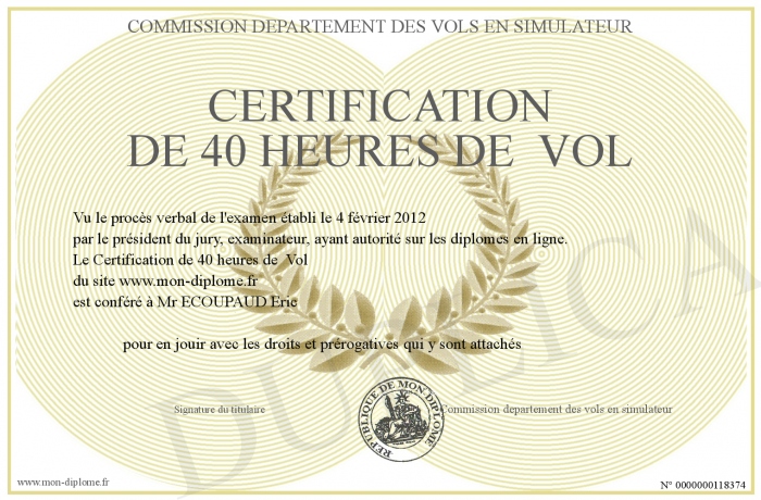 Envoyez par email votre Certification de 40 heures de Vol personalisé