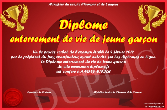 Envoyez par email votre Diplome enterrement de vie de jeune garçon personalisé