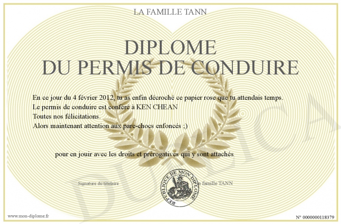Envoyez par email votre Diplôme du permis de conduire personalisé