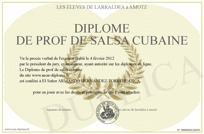Envoyez par email votre Diplome de prof de salsa cubaine personalisé