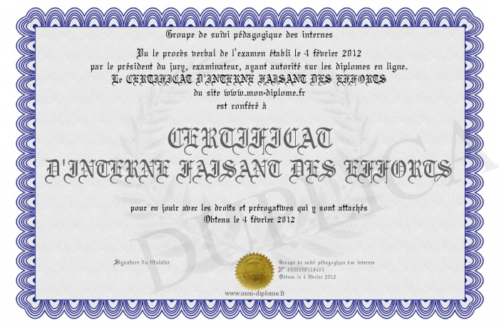 Envoyez par email votre CERTIFICAT D'INTERNE FAISANT DES EFFORTS personalisé