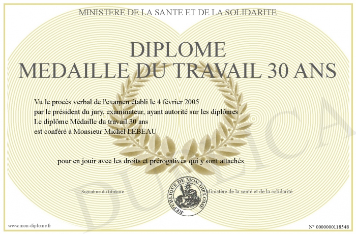 Envoyez par email votre diplôme médaille du travail 30 ans personalisé