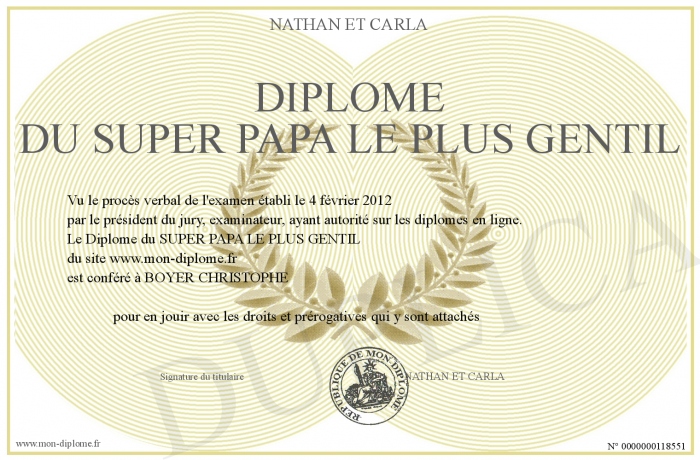 Envoyez par email votre Diplôme du SUPER PAPA LE PLUS GENTIL personalisé