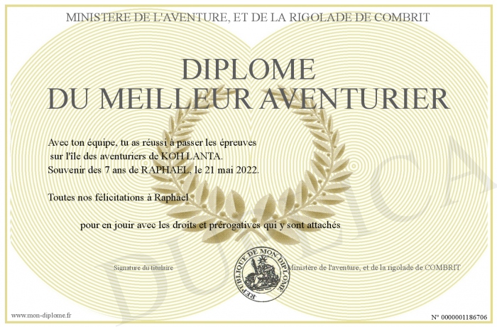 Envoyez par email votre Diplôme du MEILLEUR AVENTURIER personalisé