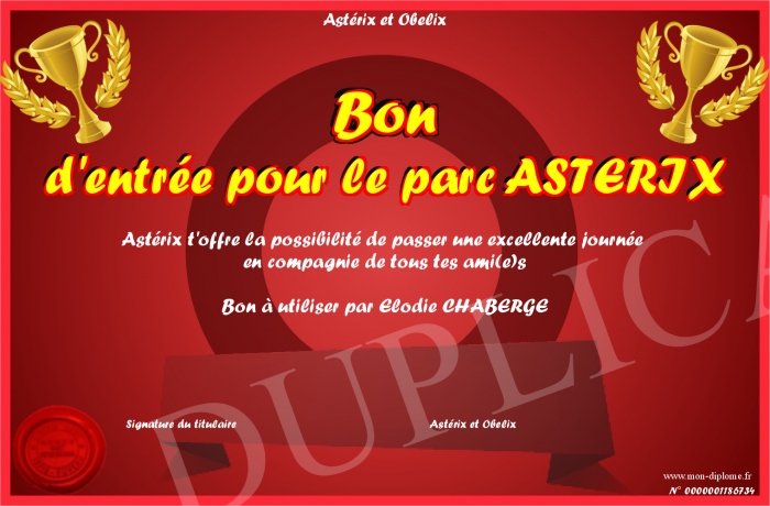 Envoyez par email votre Bon d'entrée pour le parc ASTERIX personalisé