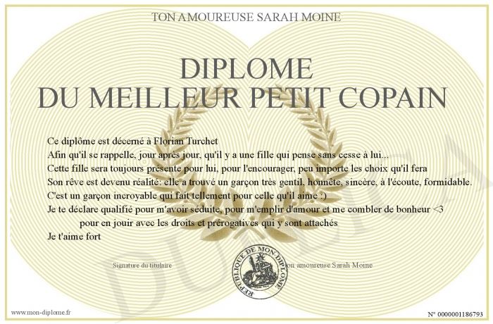 Envoyez par email votre Diplôme du meilleur petit copain personalisé