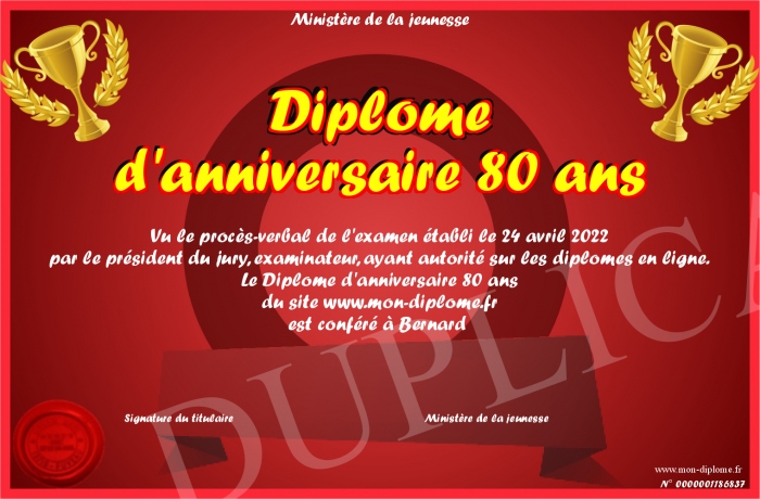 Envoyez par email votre Diplôme d'anniversaire 80 ans personalisé