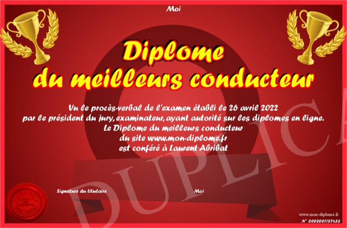 Envoyez par email votre Diplôme du meilleurs conducteur personalisé