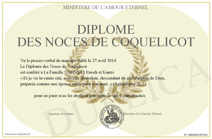 Envoyez par email votre Diplôme des Noces de Coquelicot personalisé