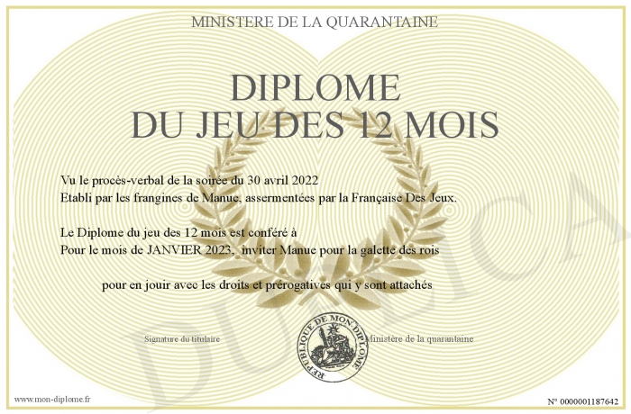 Envoyez par email votre Diplôme du jeu des 12 mois personalisé