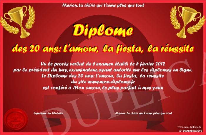 Envoyez par email votre Diplome des 20 ans: L'amour, la fiesta, la réussite personalisé