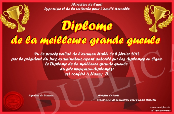 Envoyez par email votre Diplôme de la meilleure grande gueule personalisé