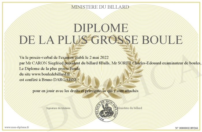 Envoyez par email votre Diplôme de la plus grosse Boule personalisé