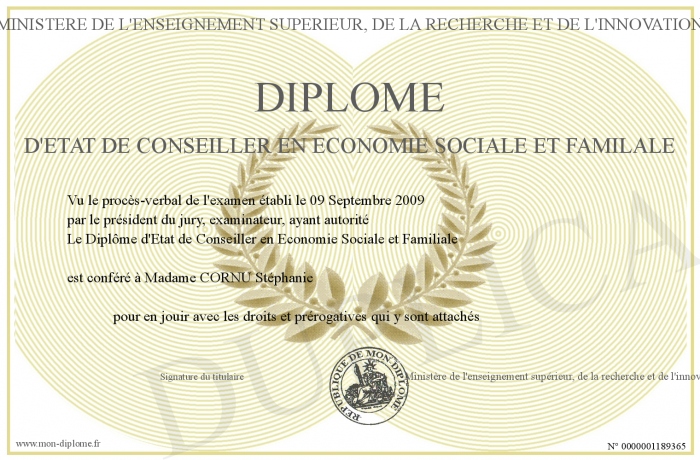 Envoyez par email votre Diplôme d'Etat de Conseiller en Economie Sociale et Familale personalisé