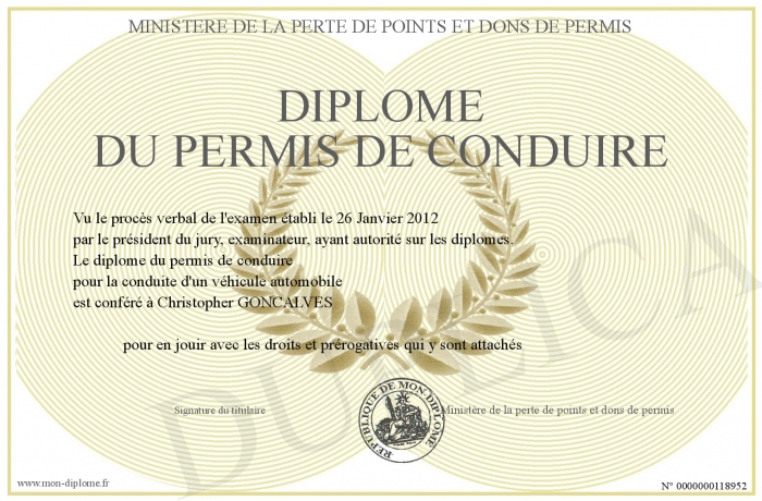 Envoyez par email votre Diplôme du permis de conduire personalisé