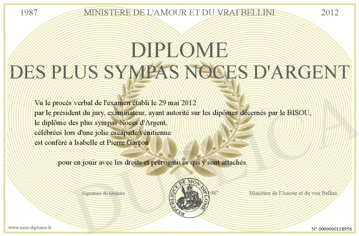 Envoyez par email votre Diplôme des plus sympas Noces d'Argent personalisé
