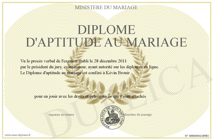 Envoyez par email votre Diplome d'aptitude au mariage personalisé