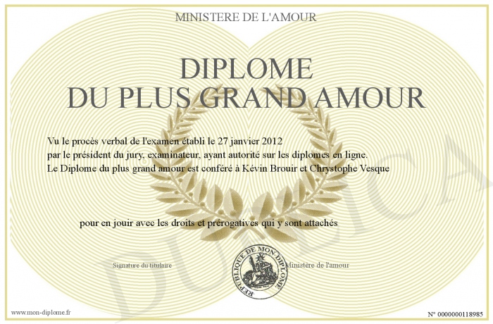 Envoyez par email votre Diplôme du plus grand amour personalisé