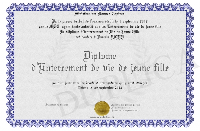 Envoyez par email votre Diplôme d'Enterrement de vie de jeune fille personalisé