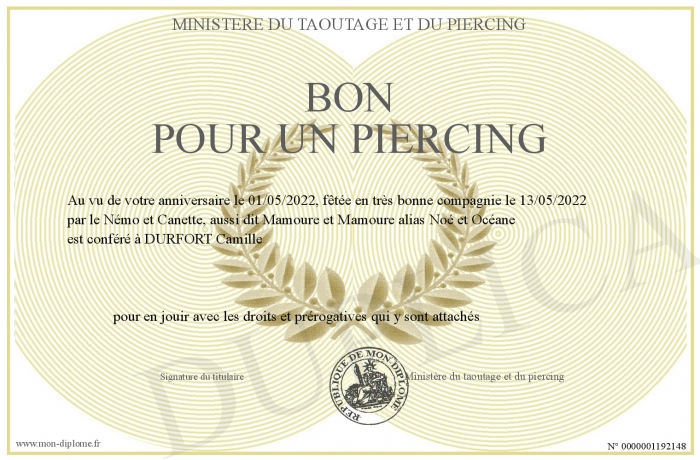 Envoyez par email votre BON POUR UN PIERCING personalisé