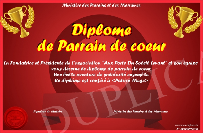 Envoyez par email votre Diplôme de Parrain de coeur personalisé