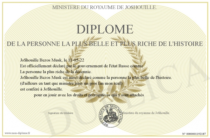 Envoyez par email votre Diplôme de la personne la plus belle et plus riche de l'histoire personalisé