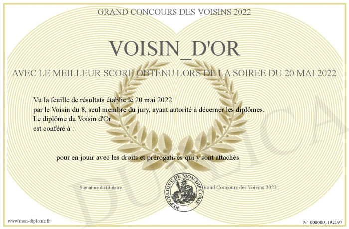 Envoyez par email votre VOISIN_D'OR avec le meilleur score obtenu lors de la soirée du 20 mai 2022 personalisé