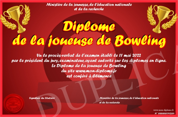 Envoyez par email votre Diplôme de la joueuse de Bowling personalisé