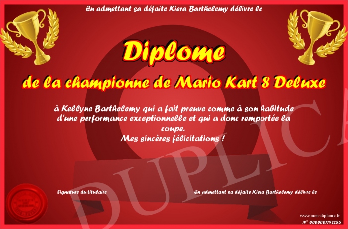 Envoyez par email votre Diplôme de la championne de Mario Kart 8 Deluxe personalisé