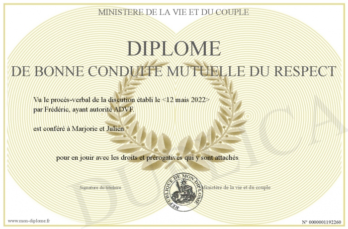 Envoyez par email votre Diplôme de bonne conduite mutuelle du respect personalisé